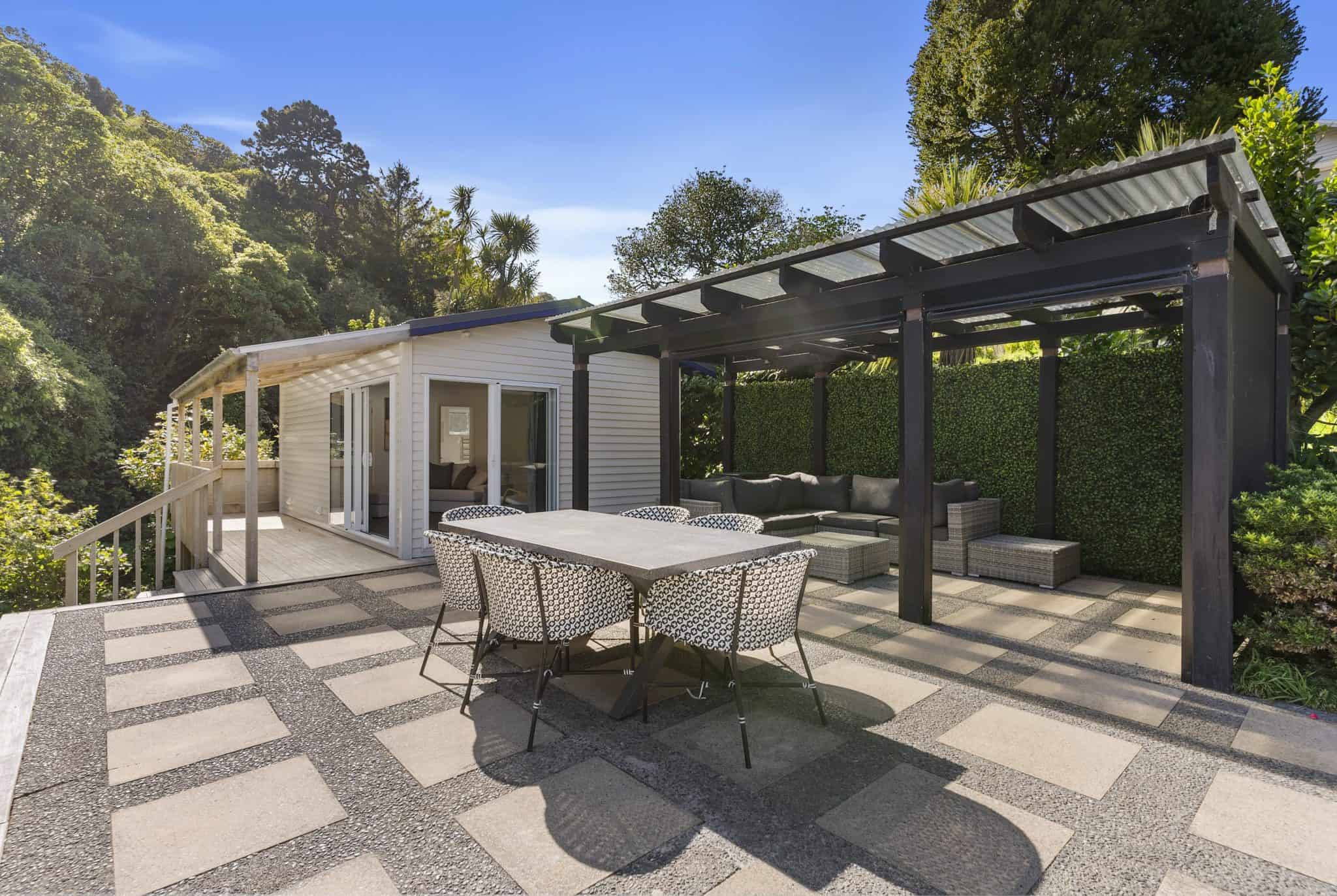 A standalone studio which incorporates a generous living space with fold out bed, storage, ensuite, heat pump and outdoor space provides incredible versatility. From a guest suite, space for teenagers, home office or income generating option with AirBnb the options are endless.