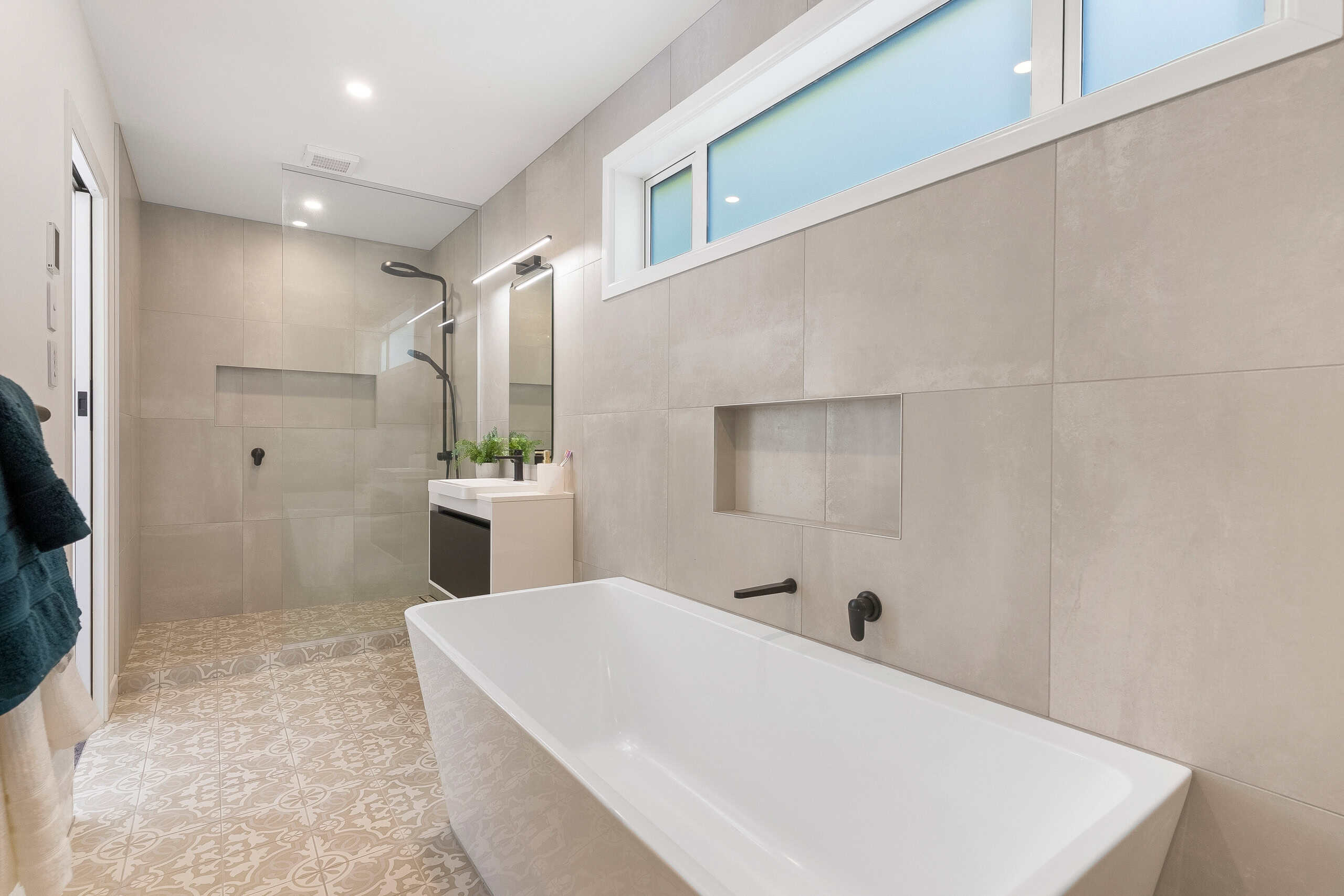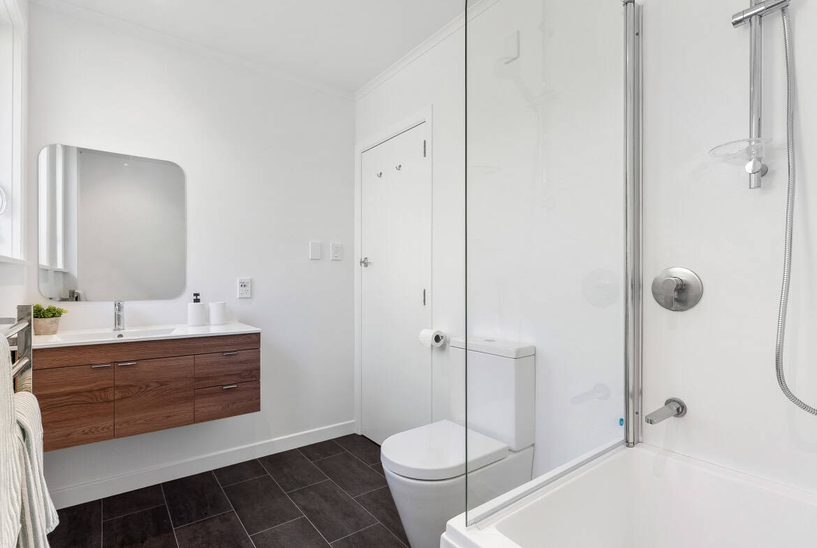 A standout feature is the full ground-floor master suite, offering a level of separation rarely found in family homes. Generous in scale, it incorporates a walk-in wardrobe and a beautifully tiled ensuite with separate shower and bath. With its own living space and direct access to a lower deck and outdoor area, this suite functions as a true retreat, perfectly suited to parents, guests, or families with older children seeking independence within the home.