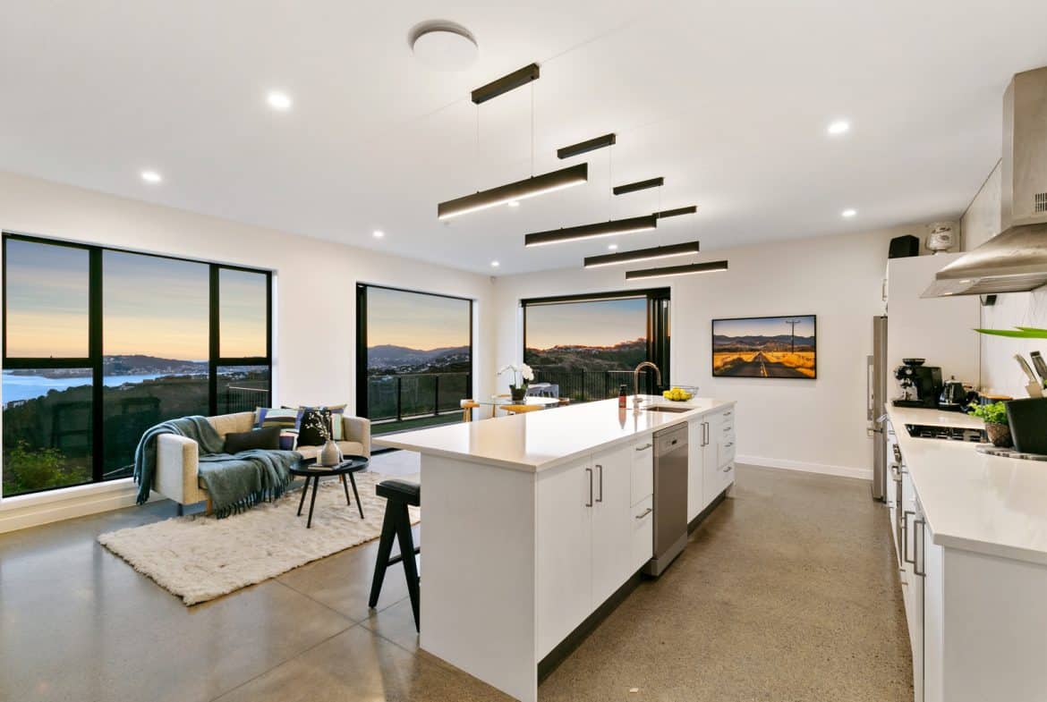 - Open plan living and family dining with panoramic views of Wellington city and across the harbour towards Eastbourne