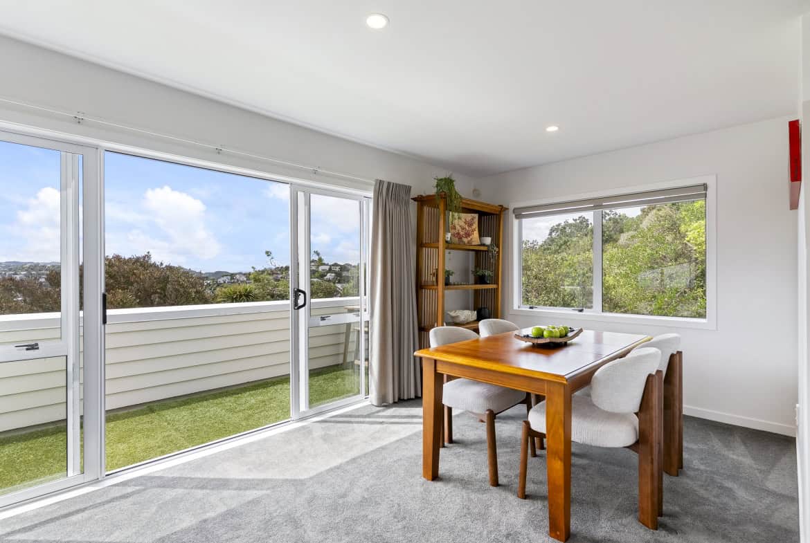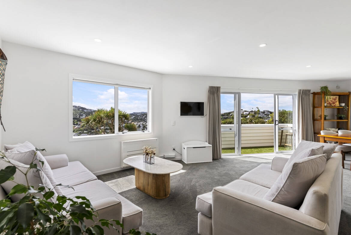 Upstairs, the light-filled open-plan living, dining and kitchen form the warm heart of the home. Sliding doors open to a sunny deck where you can relax with a coffee and soak in the outlook to Mt Kaukau. With great sun and a heat pump for year-round comfort, this is a home designed for effortless enjoyment.